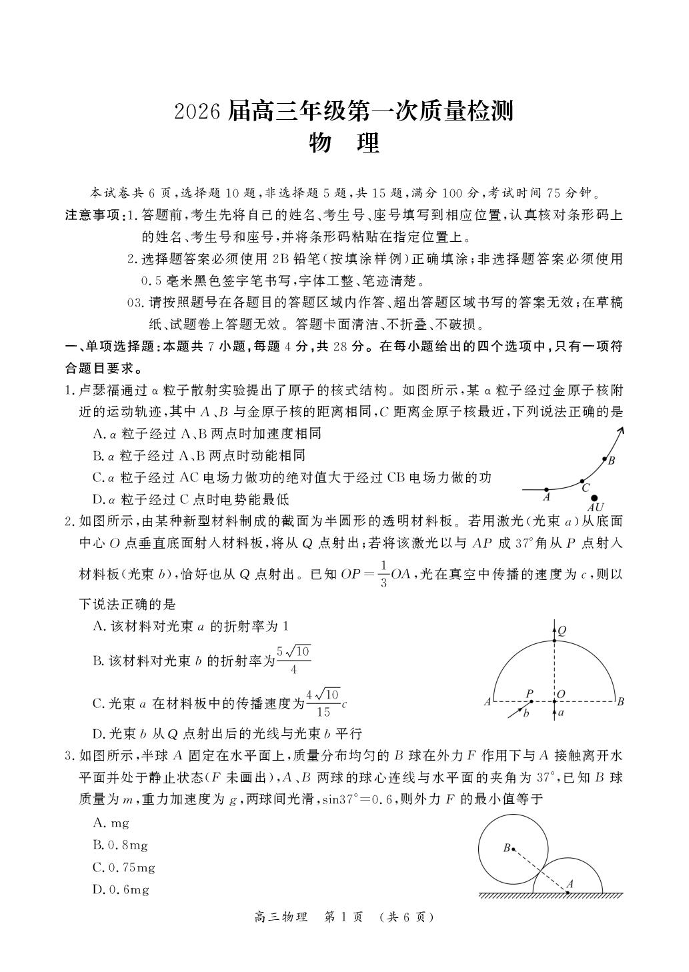 高三物理--河南省开封市2026届高三上学期第一次质量检测(开封一模)
