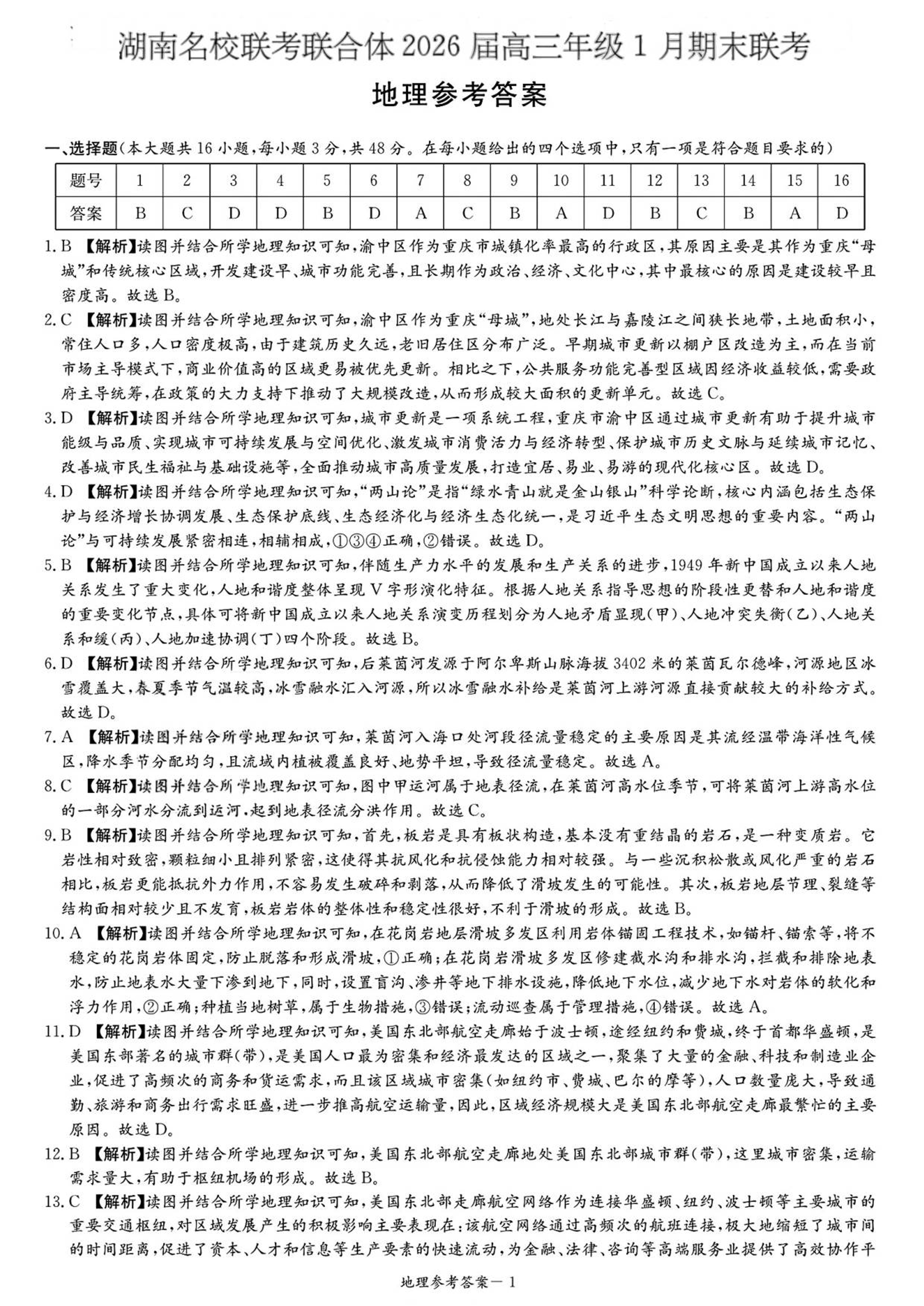 高三地理答案--湖南省名校联考联合体2025-2026学年高三上学期1月联考