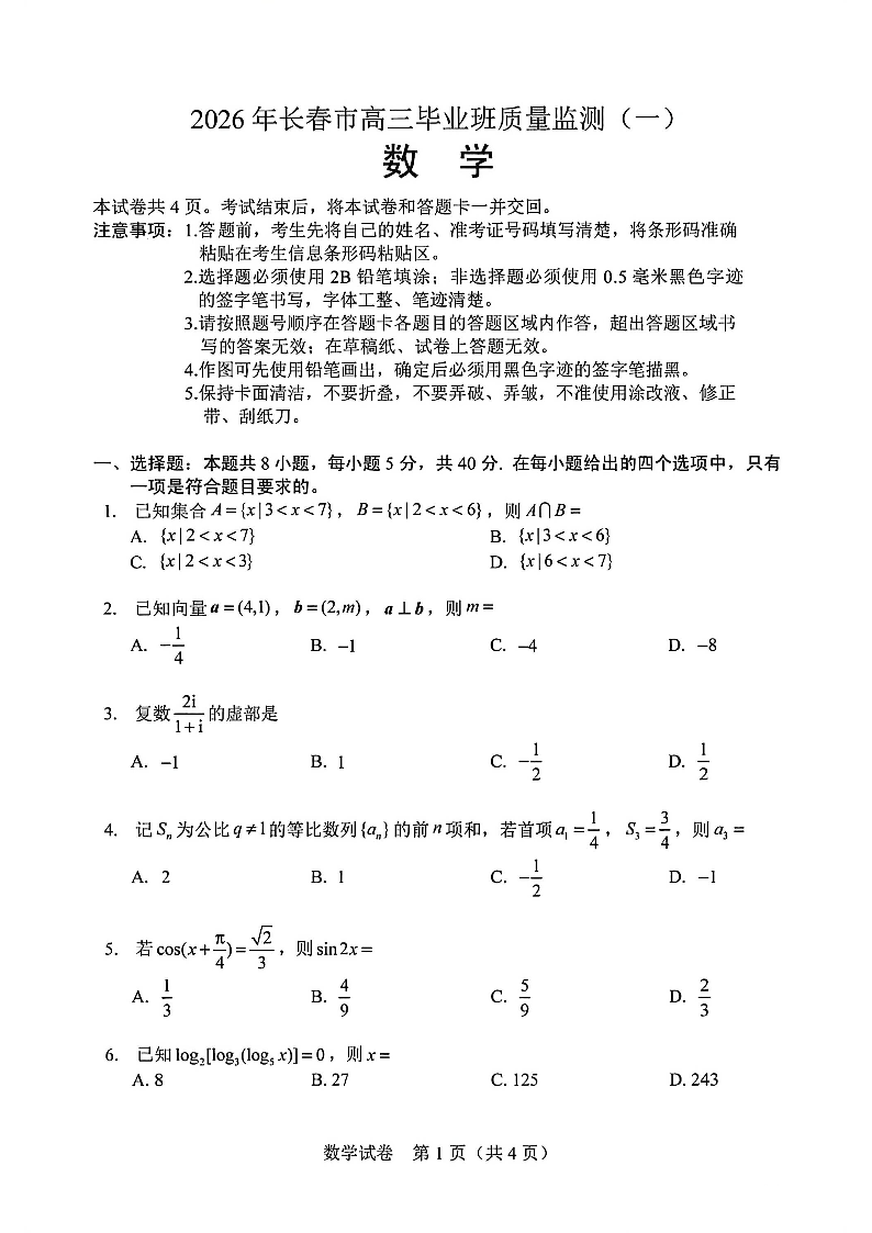 高三数学--吉林省长春市2026届高三年级质量检测(一)(长春一模)