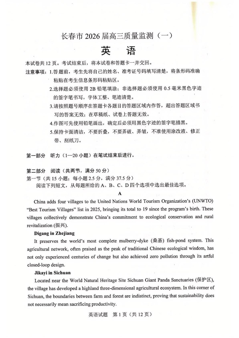 高三英语--吉林省长春市2026届高三年级质量检测(一)(长春一模)