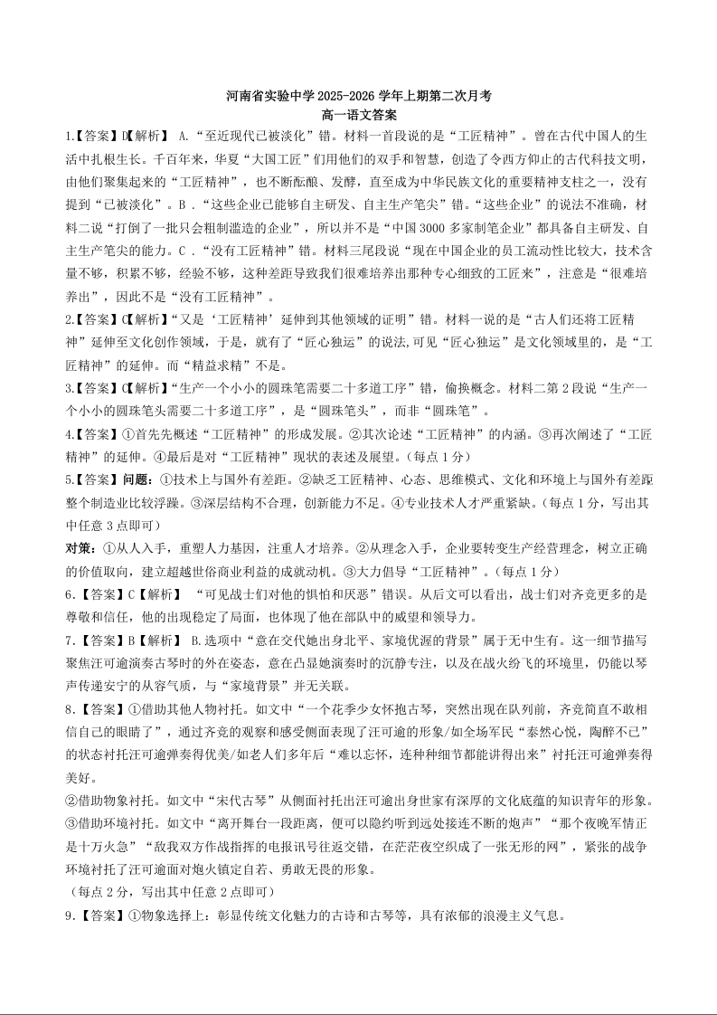 高一语文答案--河南省实验中学2025-2026学年高一上学期第二次月考