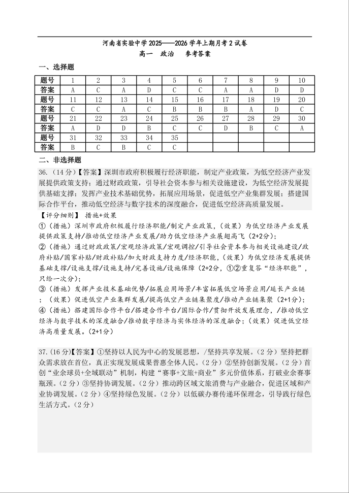 高一政治答案--河南省实验中学2025-2026学年高一上学期第二次月考