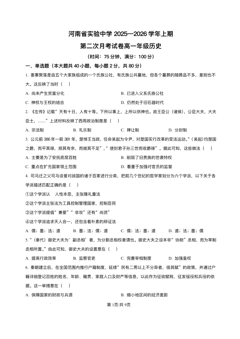 高一历史+答案--河南省实验中学2025-2026学年高一上学期第二次月考