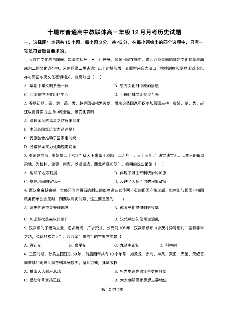 高一历史+答案--湖北省十堰市普通高中教联体2025-2026学年高一上学期12月月考
