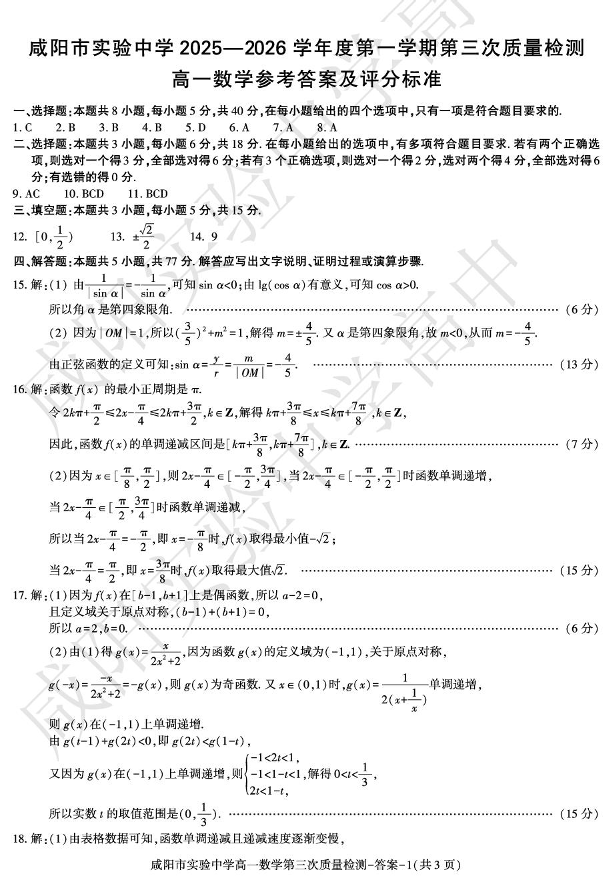高一数学答案--陕西省咸阳市实验中学2025-2026学年高一上学期第三次质量检测
