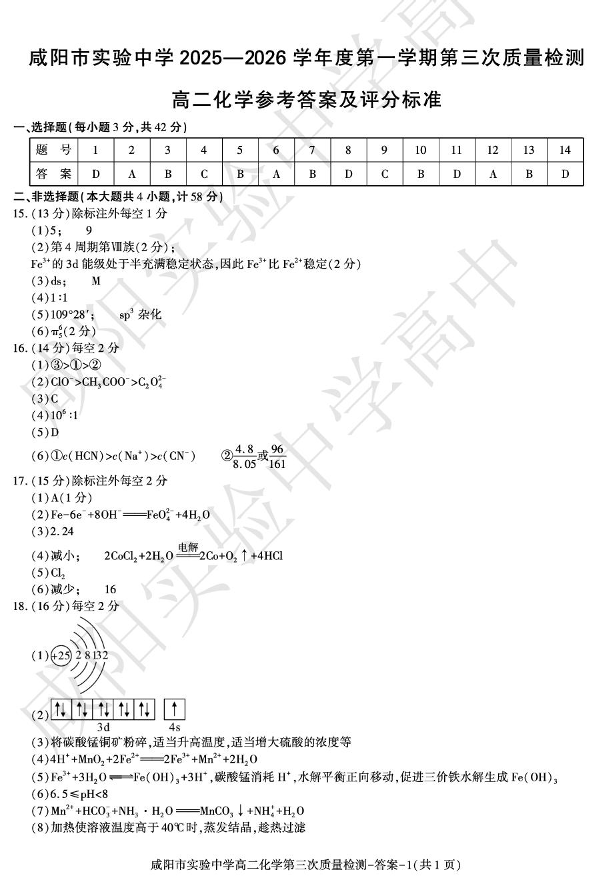 高一化学答案--陕西省咸阳市实验中学2025-2026学年高一上学期第三次质量检测