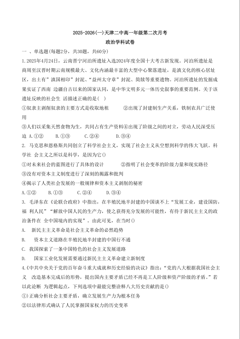高一政治--天津市第二中学2025-2026学年高一上学期12月月考