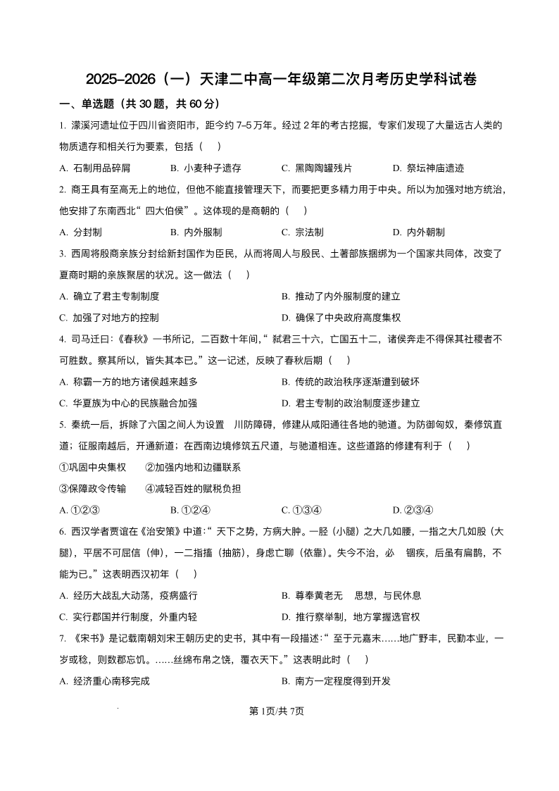 高一历史+答案 --天津市第二中学2025-2026学年高一上学期12月月考