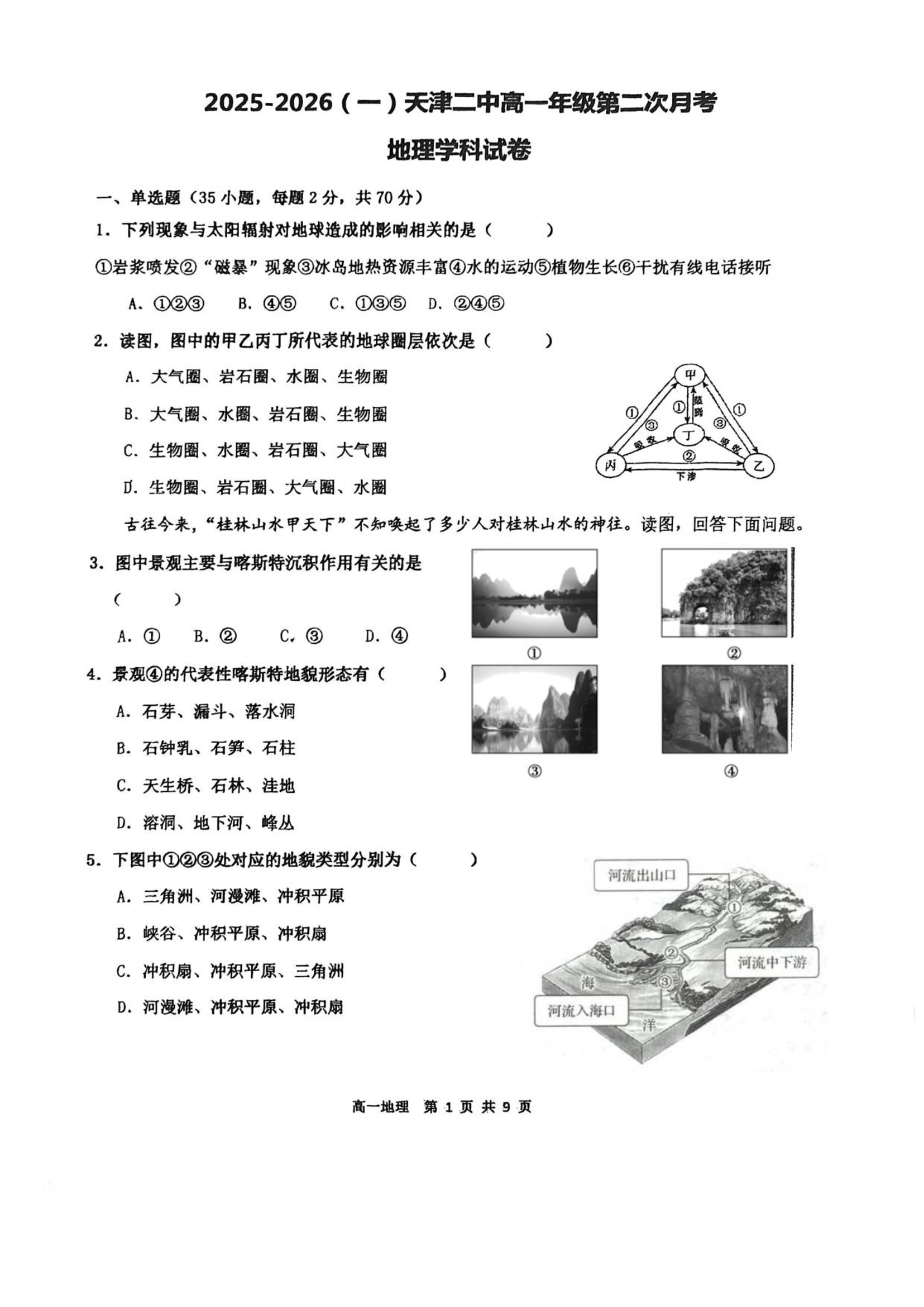 高一地理--天津市第二中学2025-2026学年高一上学期12月月考