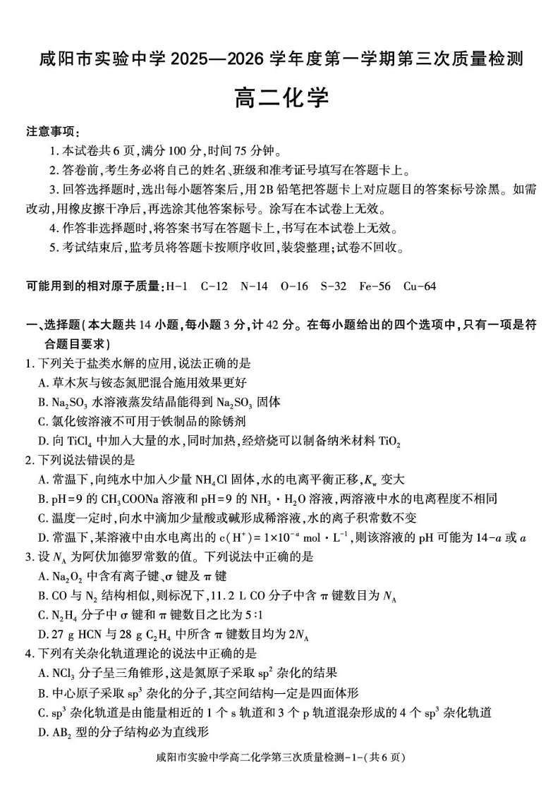 高二化学+答案--陕西省咸阳市实验中学2025-2026学年高二上学期第三次质量检测