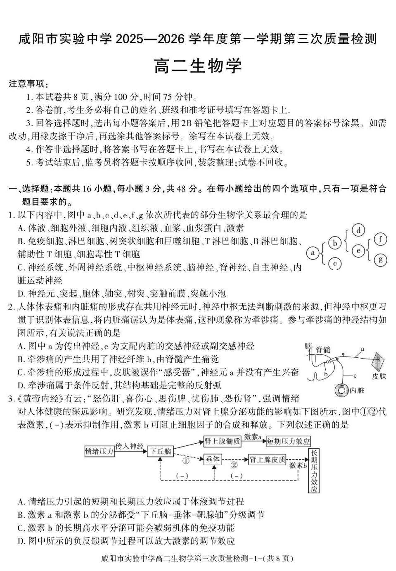 高二生物--陕西省咸阳市实验中学2025-2026学年高二上学期第三次质量检测