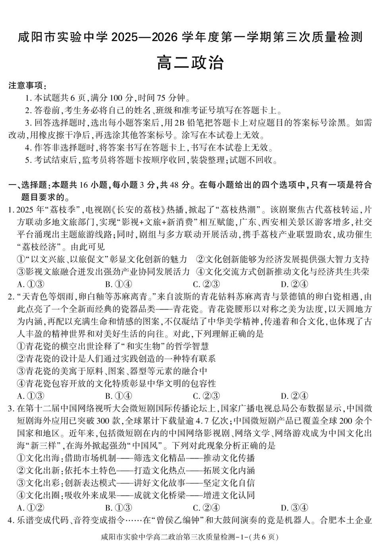 高二政治--陕西省咸阳市实验中学2025-2026学年高二上学期第三次质量检测