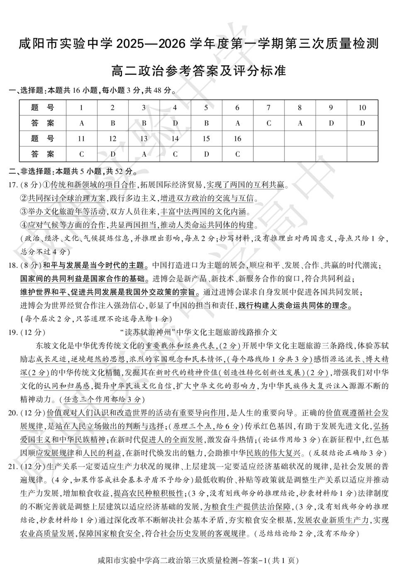 高二政治答案--陕西省咸阳市实验中学2025-2026学年高二上学期第三次质量检测