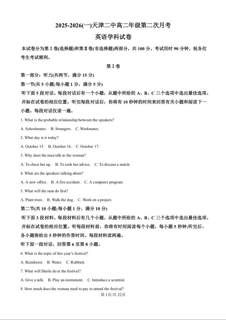 高二英语(精品解析版)--天津市第二中学2025-2026学年高二上学期12月月考