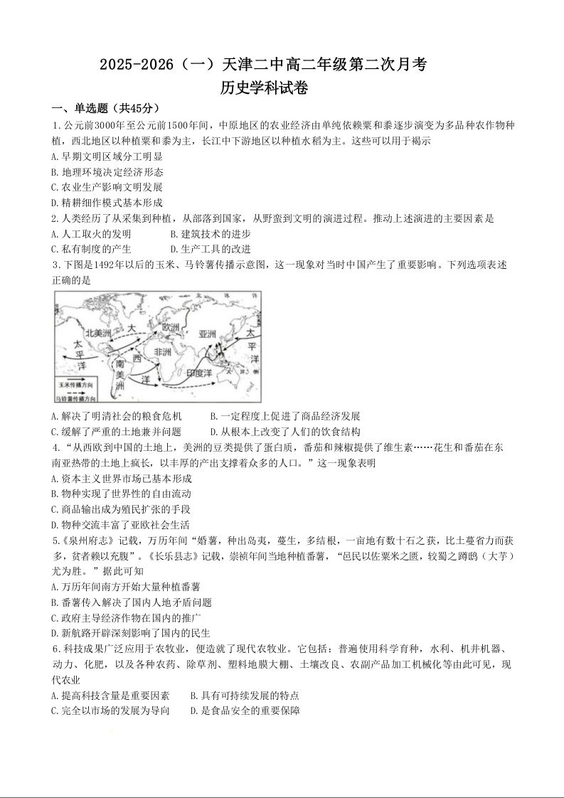高二历史+答案--天津市第二中学2025-2026学年高二上学期12月月考