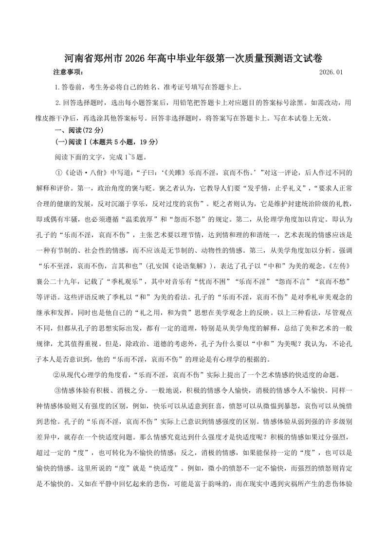 高三语文+答案--河南省郑州市2026届高三第一次质量预测(郑州一模)