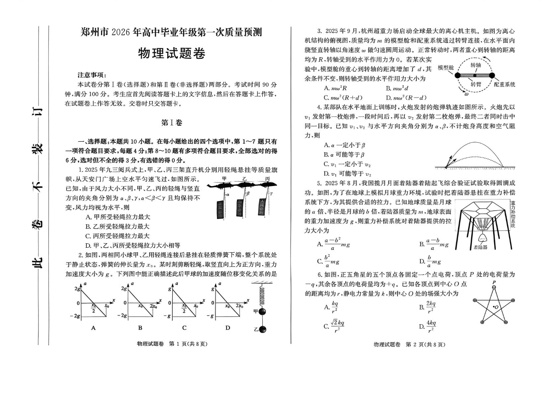 高三物理+答案--河南省郑州市2026届高三第一次质量预测(郑州一模)
