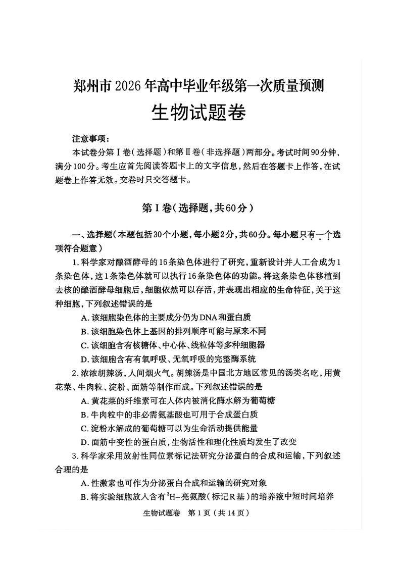 高三生物--河南省郑州市2026届高三第一次质量预测(郑州一模)