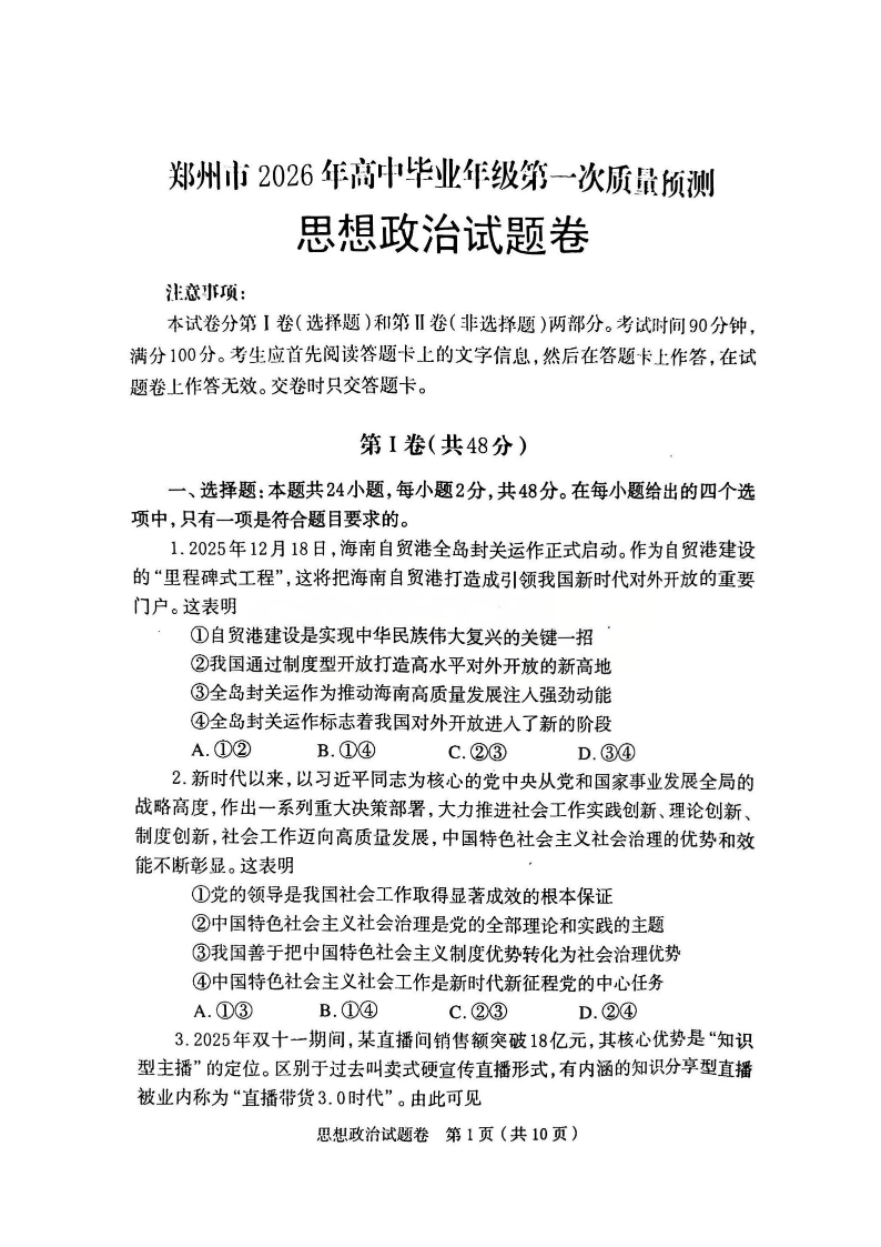 高三政治--河南省郑州市2026届高三第一次质量预测(郑州一模)