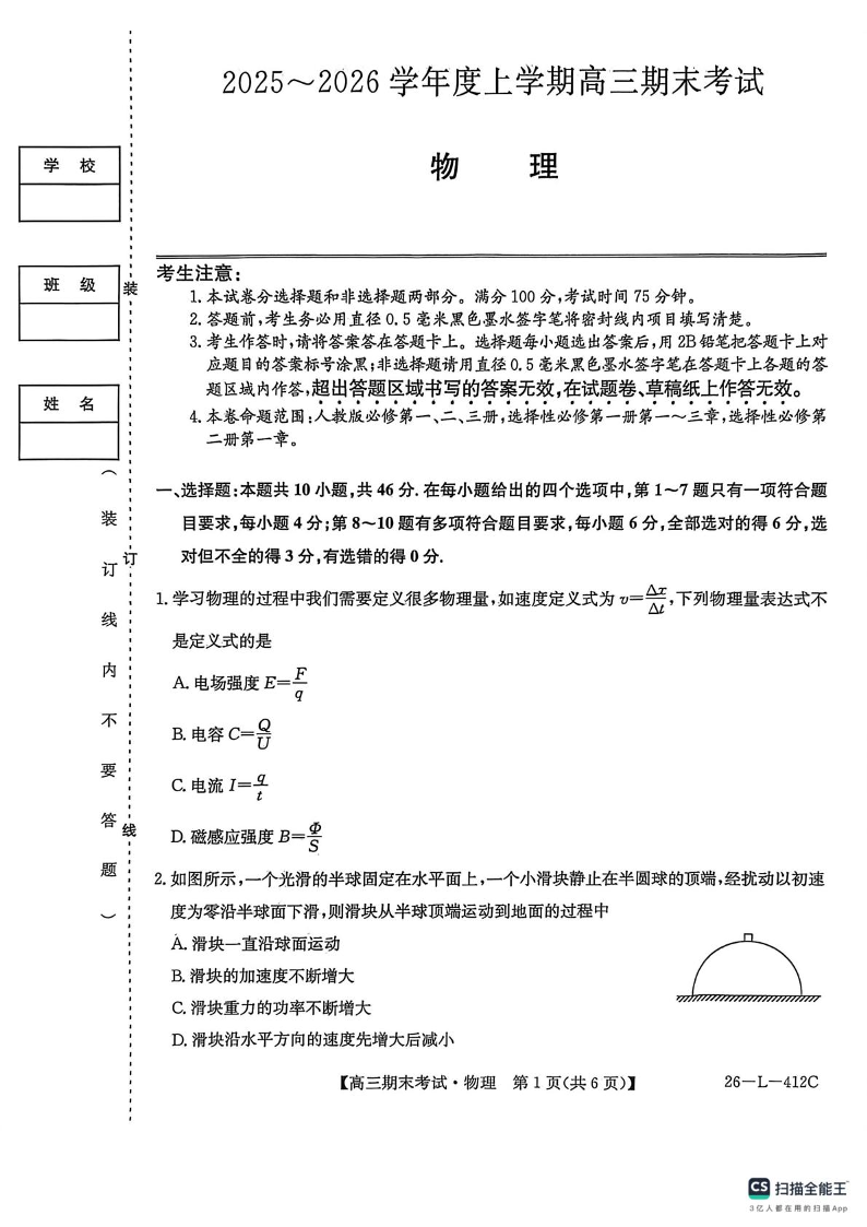高三物理--黑龙江省齐齐哈尔市2026届高三上学期1月期末考试