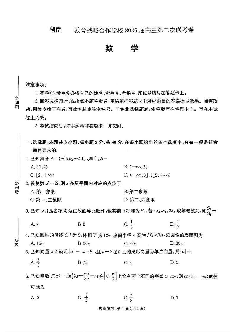 高三数学+答案--湖南佩佩教育战略合作学校2026届高三1月第二次联考