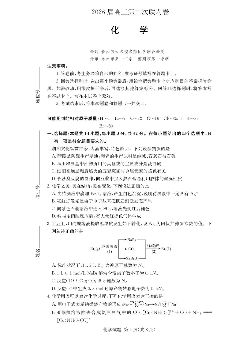 高三化学+答案--湖南佩佩教育战略合作学校2026届高三1月第二次联考