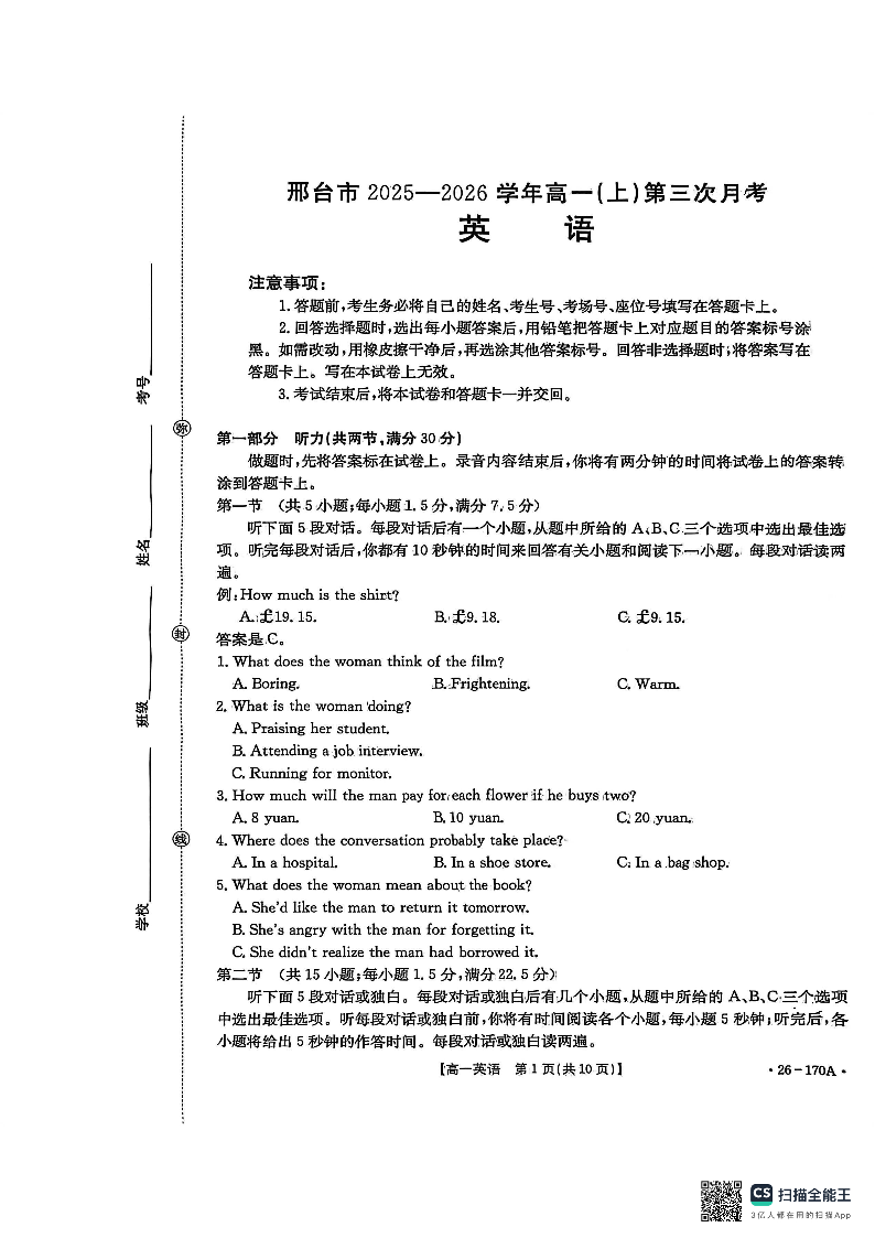 高一英语--河北省邢台市2025-2026学年高一上学期第三次月考