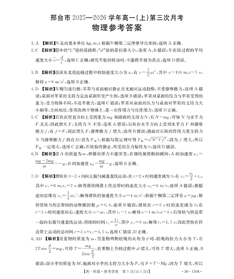 高一物理答案--河北省邢台市2025-2026学年高一上学期第三次月考