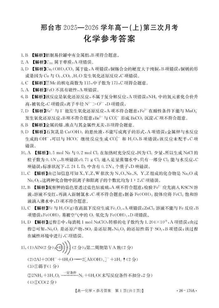 高一化学答案--河北省邢台市2025-2026学年高一上学期第三次月考