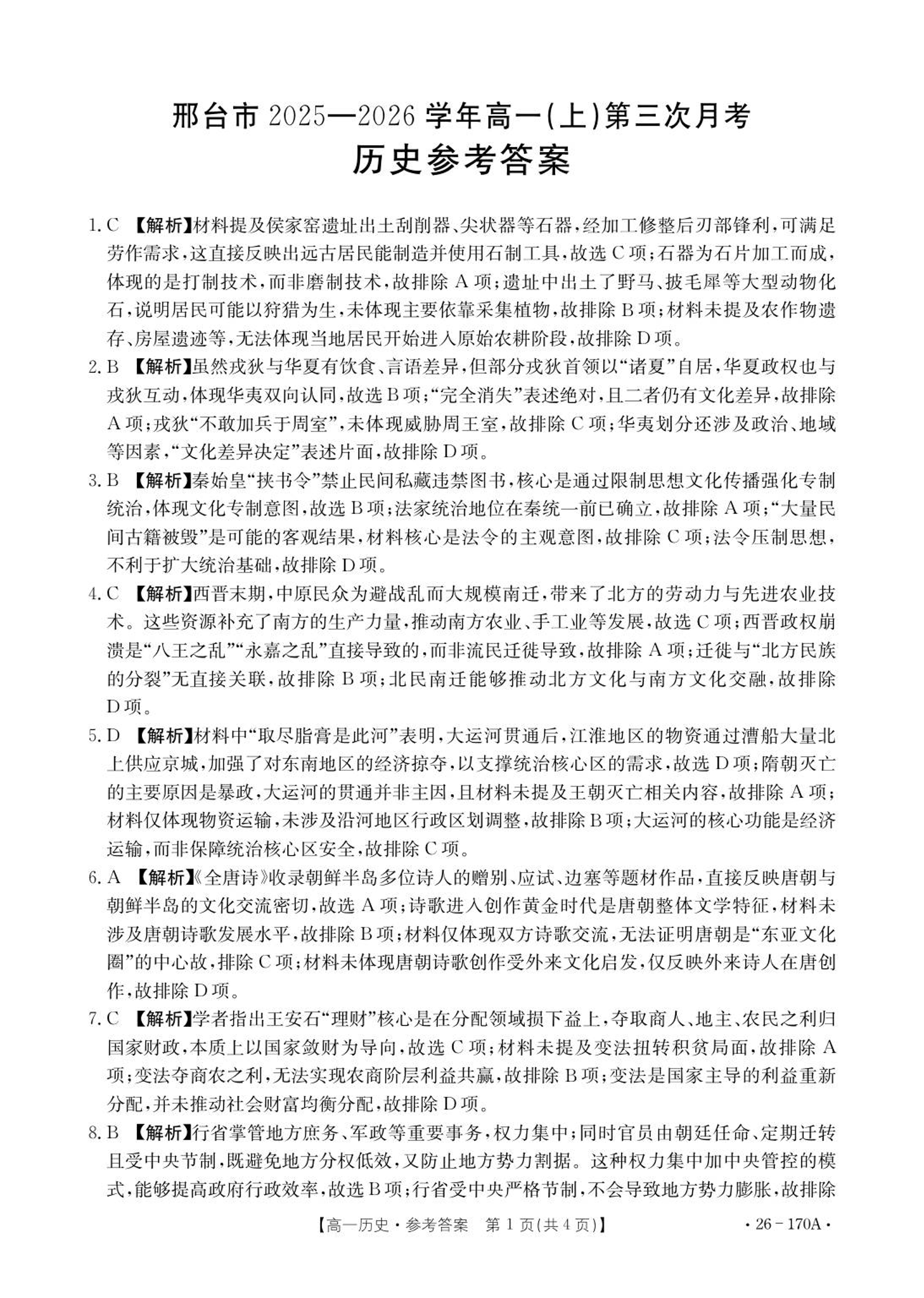 高一历史答案--河北省邢台市2025-2026学年高一上学期第三次月考