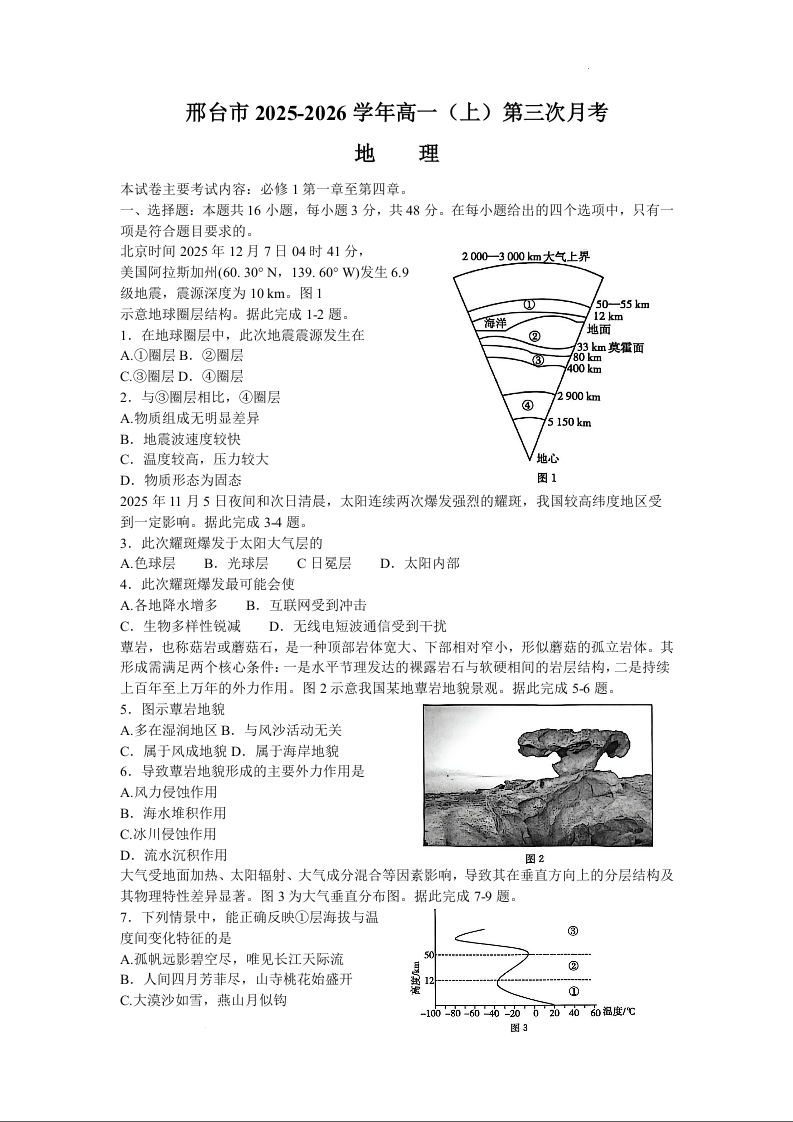 高一地理+答案--河北省邢台市2025-2026学年高一上学期第三次月考