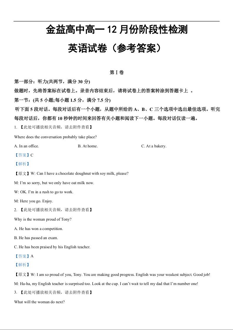 高一英语答案--湖北省孝感市汉川市金益高级中学2025-2026学年高一上学期12月月考