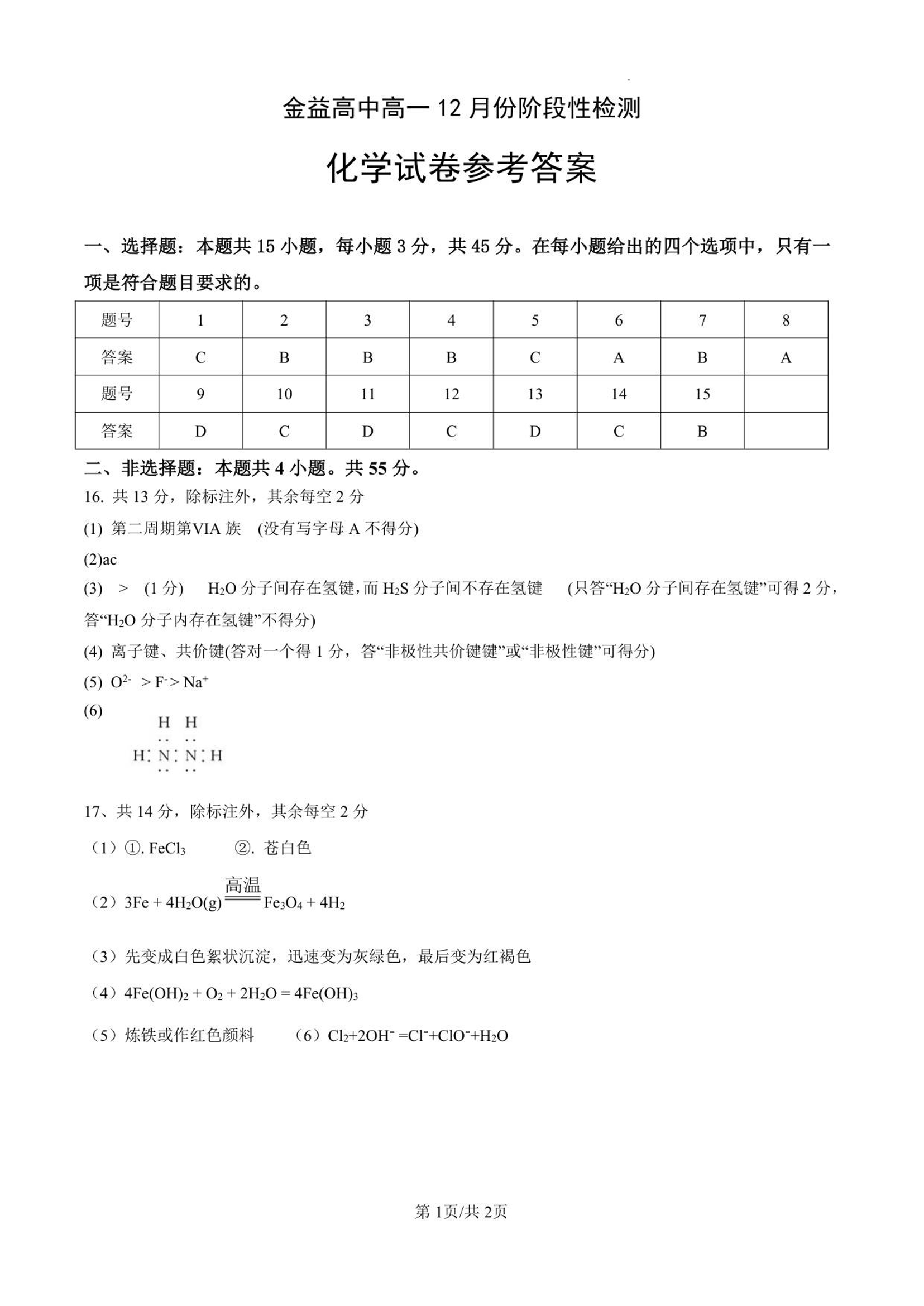 高一化学答案--湖北省孝感市汉川市金益高级中学2025-2026学年高一上学期12月月考
