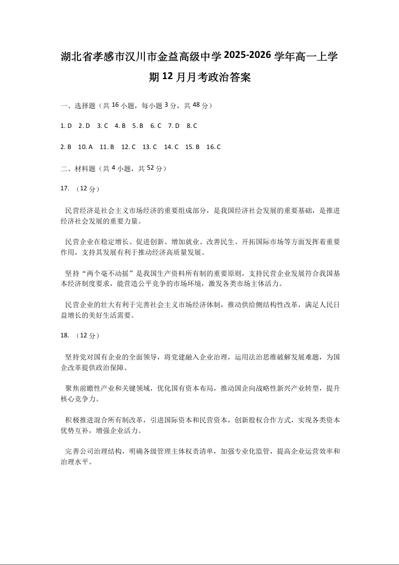 高一政治答案--湖北省孝感市汉川市金益高级中学2025-2026学年高一上学期12月月考
