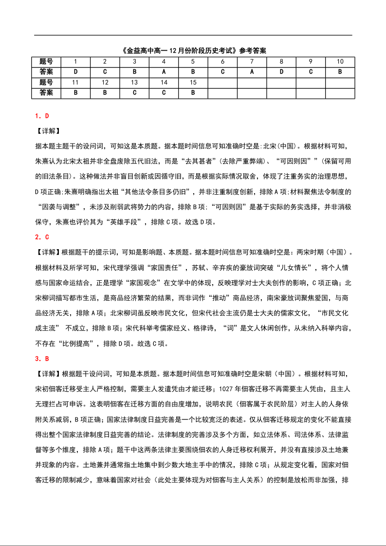 高一历史答案--湖北省孝感市汉川市金益高级中学2025-2026学年高一上学期12月月考