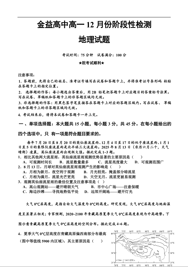 高一地理--湖北省孝感市汉川市金益高级中学2025-2026学年高一上学期12月月考