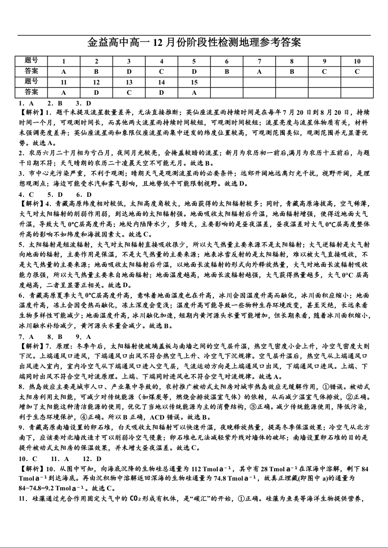 高一地理答案--湖北省孝感市汉川市金益高级中学2025-2026学年高一上学期12月月考