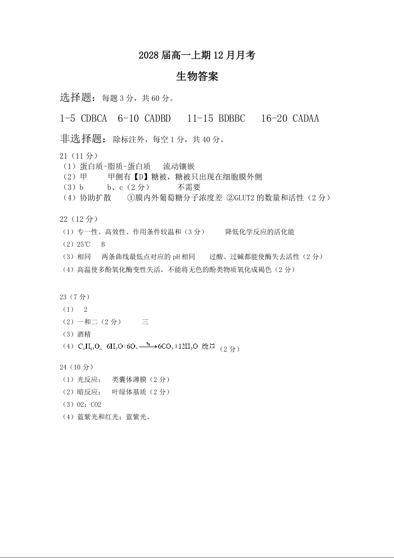 高一生物答案--四川省眉山市仁寿第一中学校(北校区)2025-2026学年高一上学期12月月考