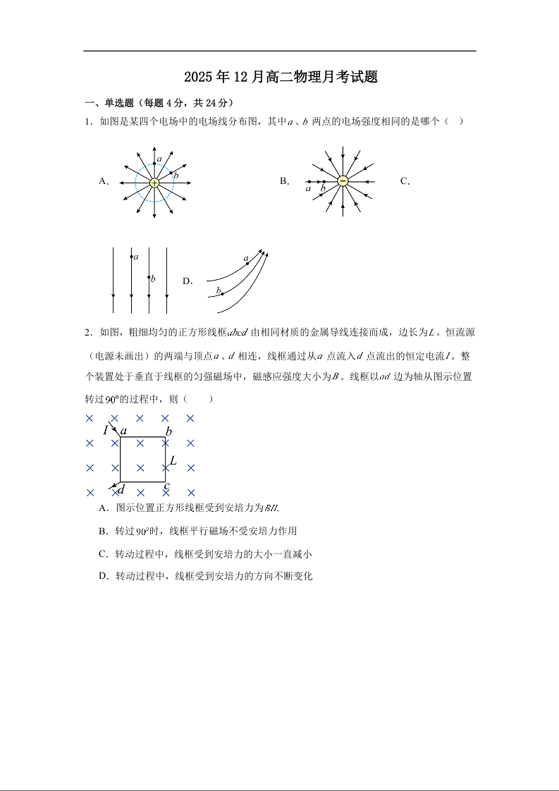 高二物理+答案--湖南省岳阳市汨罗市第二中学2025-2026学年高二上学期12月月考