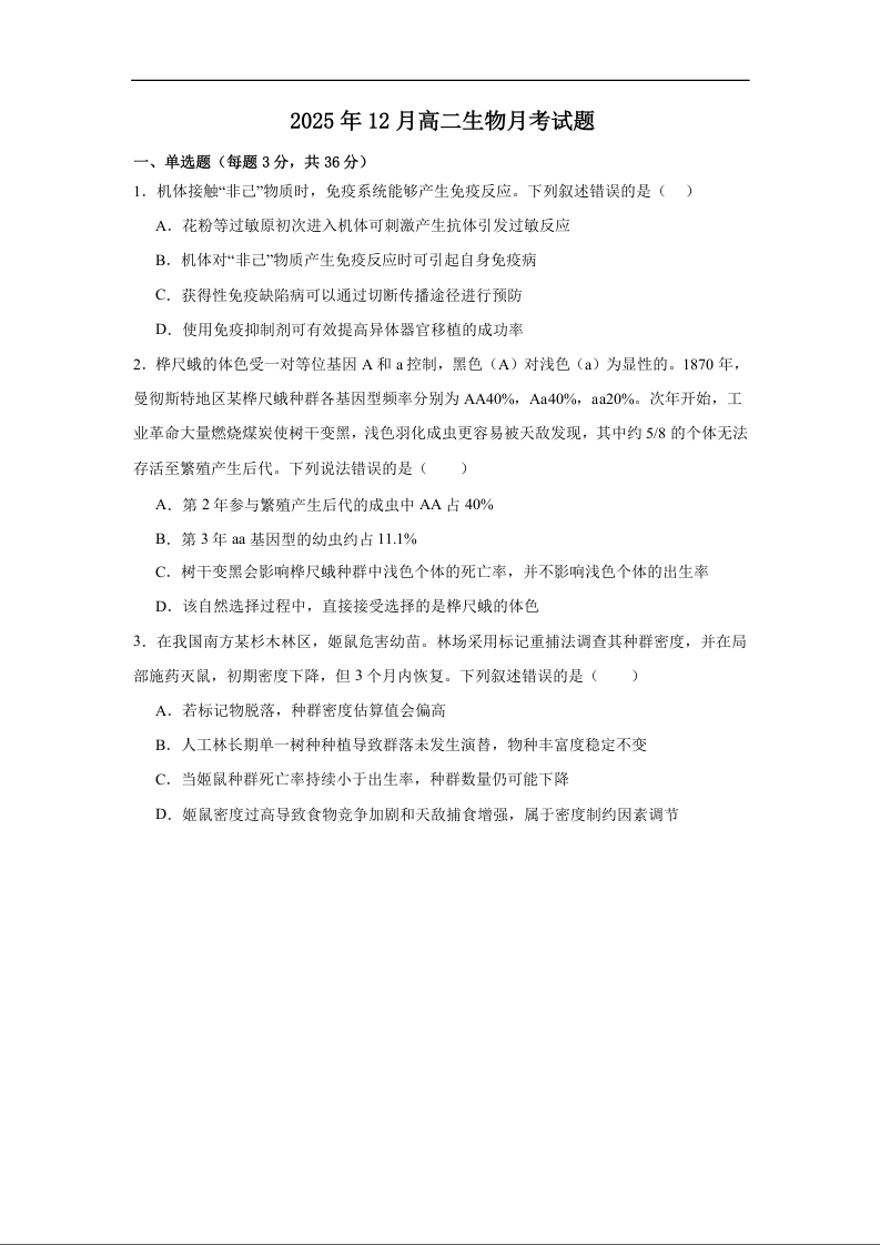 高二生物+答案--湖南省岳阳市汨罗市第二中学2025-2026学年高二上学期12月月考