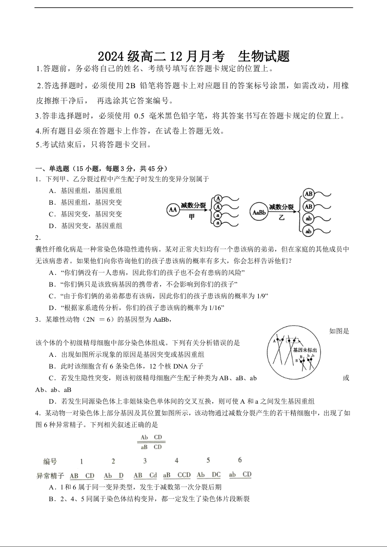 高二生物+答案--四川省眉山市仁寿县第一中学校南校区2025-2026学年高二上学期12月月考