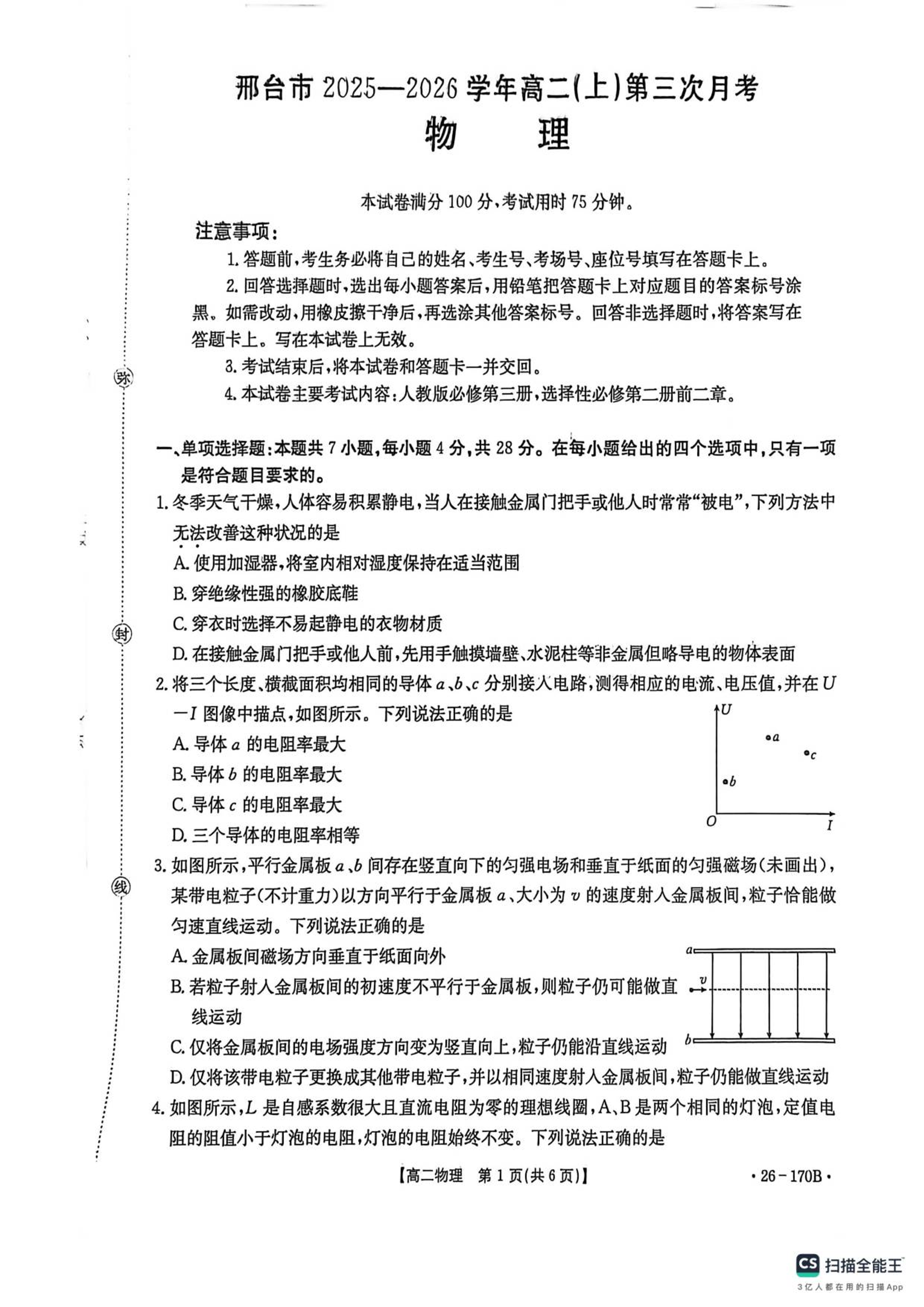 高二物理--河北省邢台市2025-2026学年高二上学期第三次月考