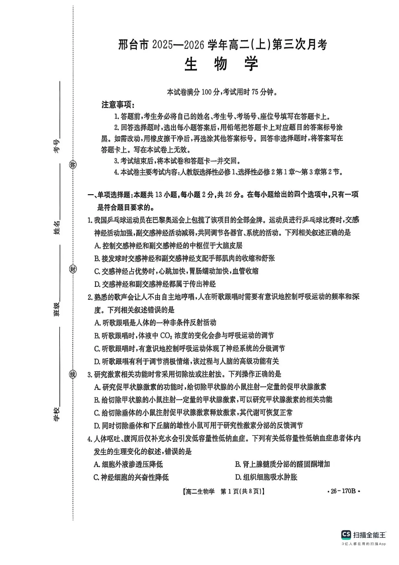 高二生物+答案--河北省邢台市2025-2026学年高二上学期第三次月考