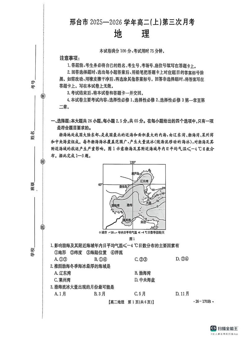 高二地理+答案--河北省邢台市2025-2026学年高二上学期第三次月考