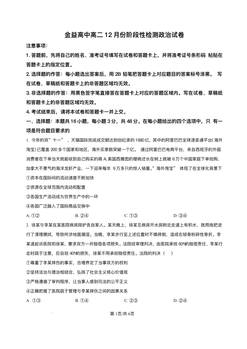 高二政治+答案--湖北省孝感市汉川市金益高级中学2025-2026学年高二上学期12月月考