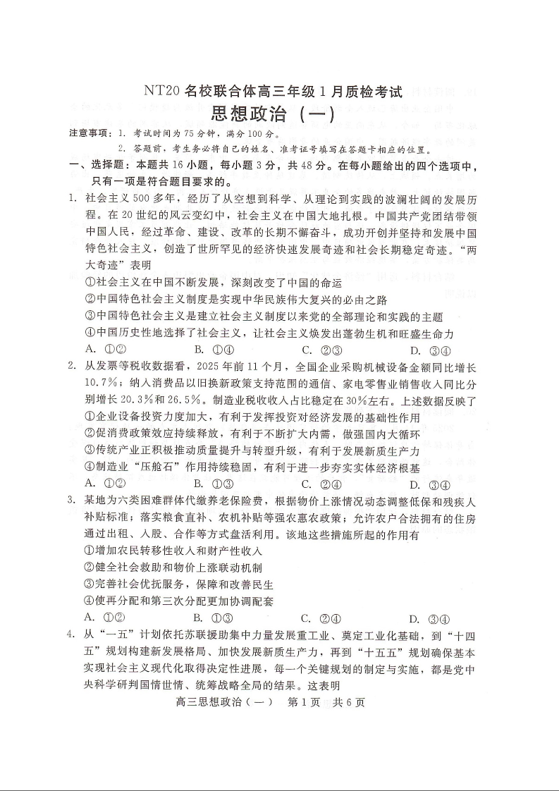 高三政治--河北省NT20名校联合体2026届高三上学期1月质检考试试卷