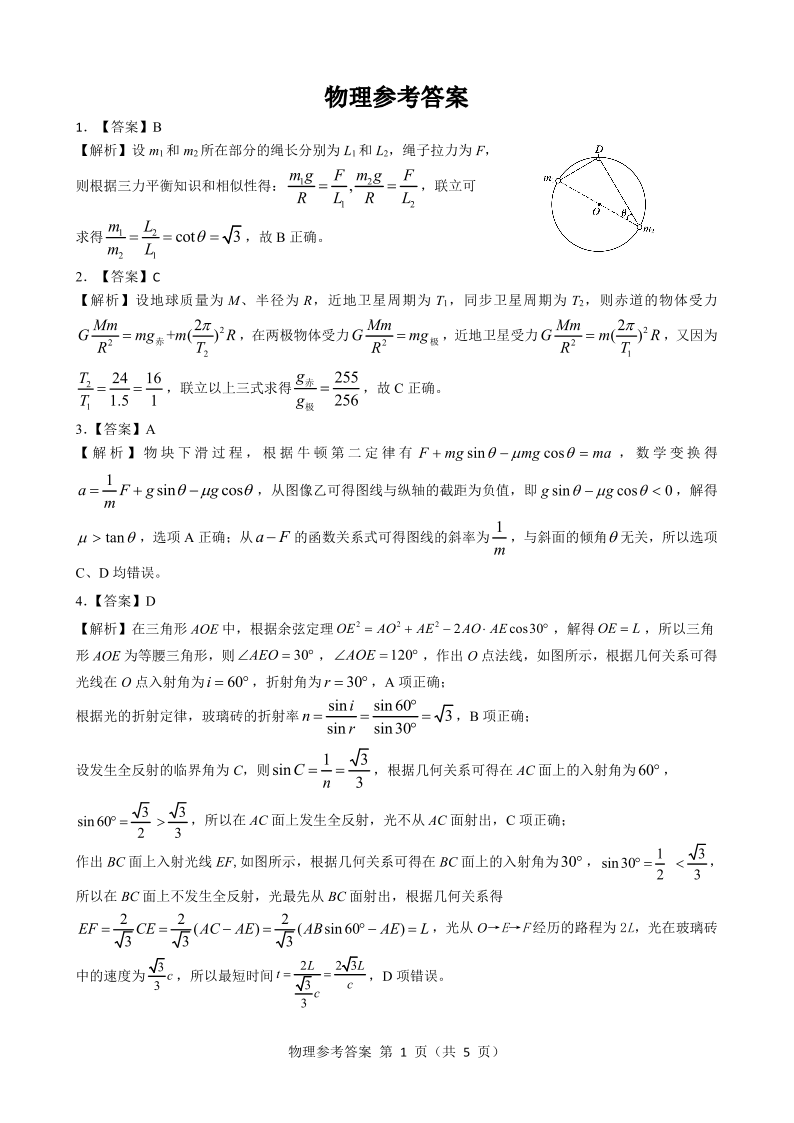 高三物理答案--山西省(三重教育)2023高三开学摸底考试