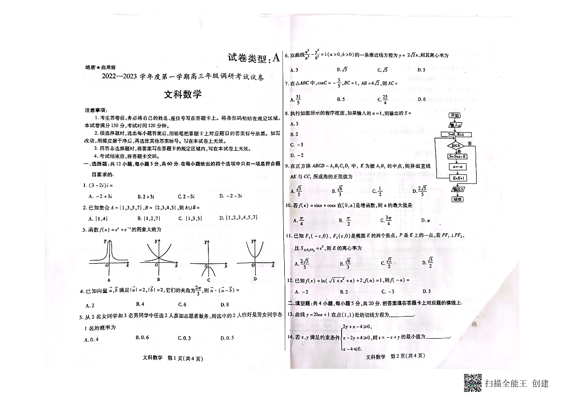 高三数学(文)--内蒙古包头市2023高三上学期开学调研考试