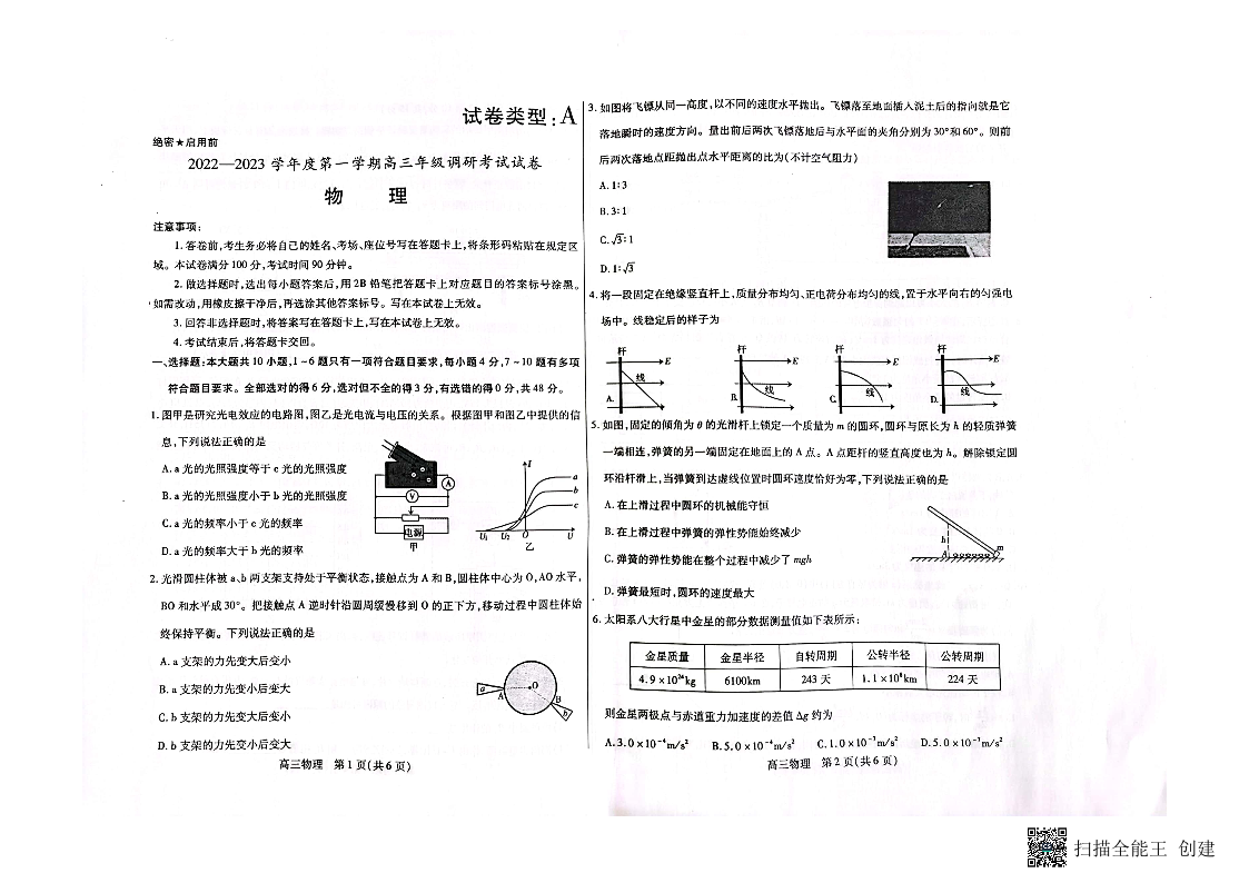 高三物理--内蒙古包头市2023高三上学期开学调研考试