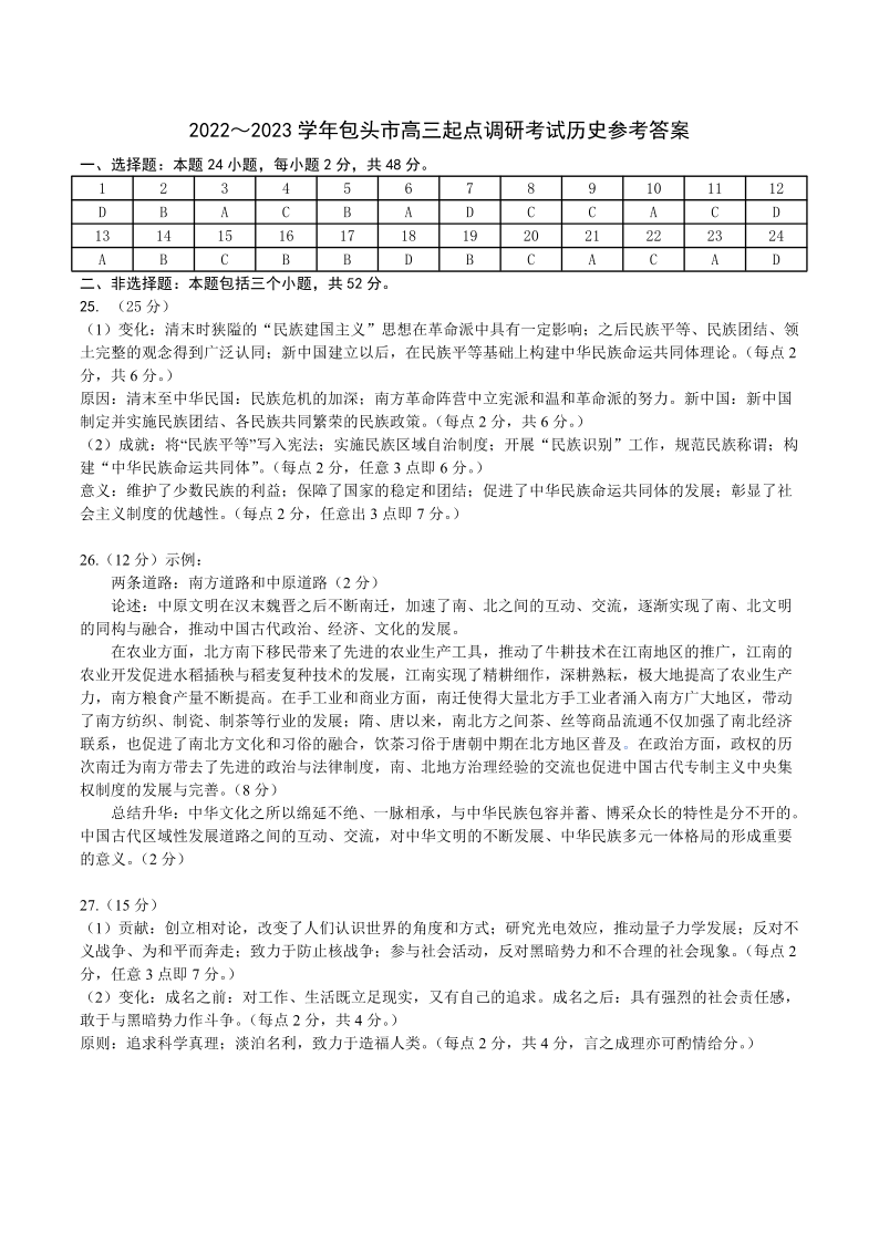 高三历史答案--内蒙古包头市2023高三上学期开学调研考试